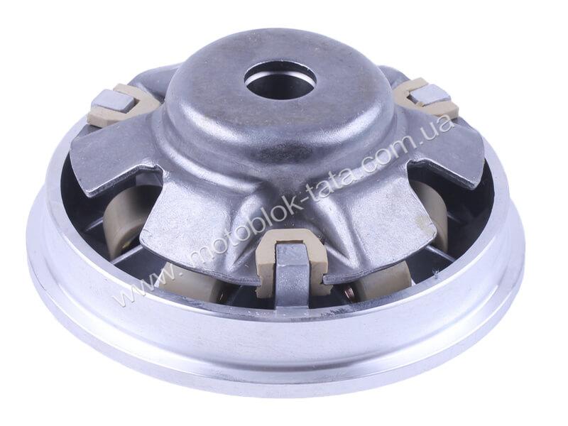 Варіатор передній у зборі YBX на бензиновий двигун 125/150CC це готовий до встановлення вузол автоматичної трансмісії, який перетворює оберти двигуна на тягову силу на заднє колесо без механічних перемикань передач. До складу збірки входять провідний варіаторний блок з рухомими та нерухомими шківами, ролики (або грузики-weights), що направляє для ременя, внутрішня втулка та корпус, виконані з урахуванням штатної посадки на кривошипний вал конкретних китайських моделей. Конструкція спроектована так, щоб забезпечувати плавну зміну передавального числа зі збільшенням обертів двигуна і навантаження на привід.