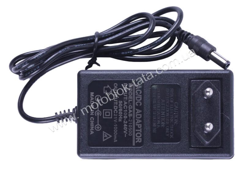 Зарядний пристрій TT AGRO MOTO, 21V на пилу аккумуляторную – предназначено для восполнения литий ионных аккумуляторных батарей с номинальным напряжением 21 вольт. Данные аккумуляторы предназначены для использования с цепными электропилами и обеспечивают их автономную работу. Устройство представляет собой понижающий источник питания, собранный по импульсной технологии, что обеспечивает низкий вес, высокий КПД преобразования энергии, компактные размеры. Пластиковый корпус в форме сетевого адаптера защищает внутренние компоненты от попадания влаги и механических повреждений. Кабель питания заканчивается разъемом для простоты подключения к АКБ. Устройство имеет защиту от короткого замыкания и превышения нагрузки.